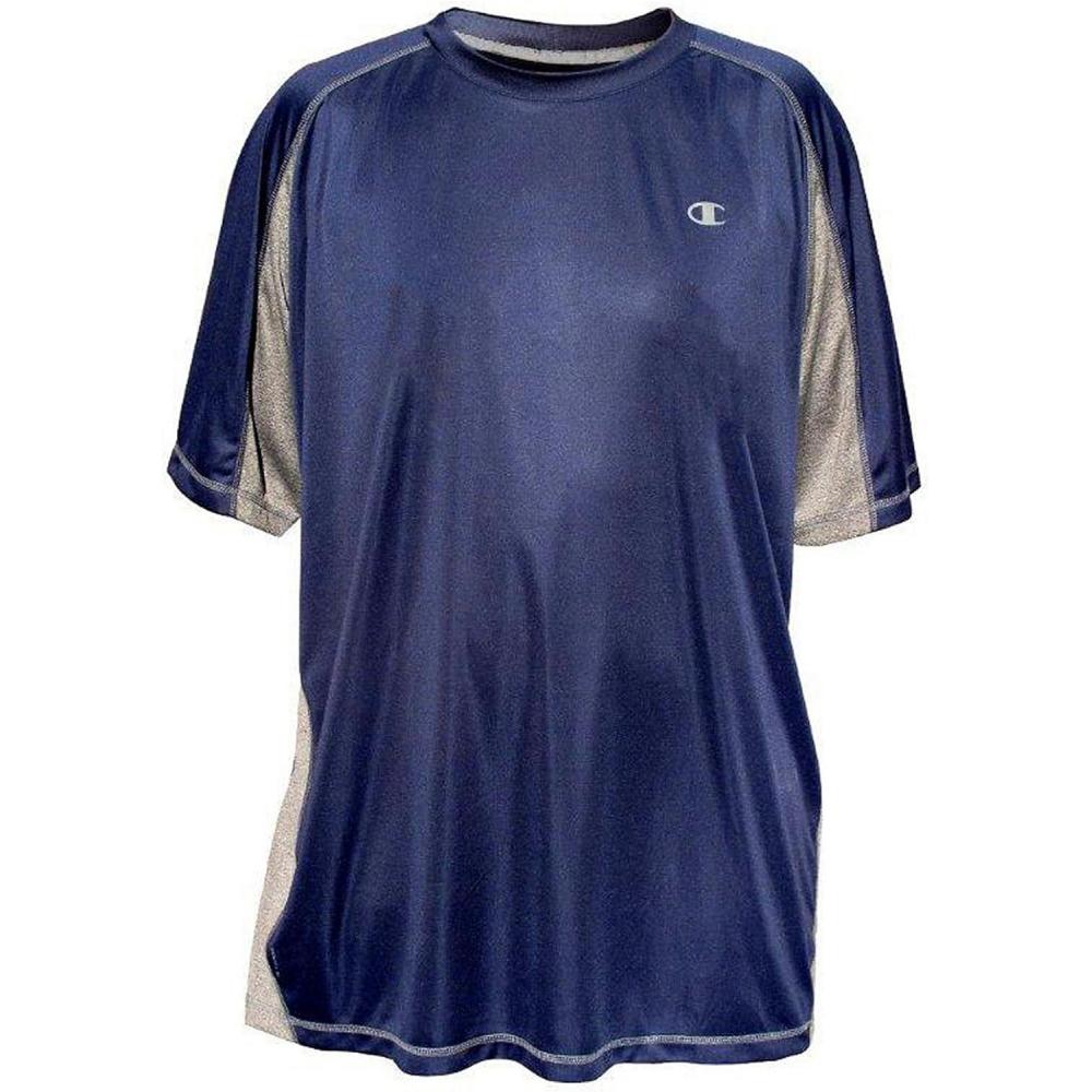 New, first quality, Champion PowerTrain Tech performance crewneck T-Shirt. Sleeves and sides have contrasting heather gray color panels. Full cut and sized properly for Big and Tall Men. Moisture-wicking Vapor technology keeps you dry even during the most vigorous workout. Ribbed neckline with reinforced binding along inside back neck. 100% Polyester – Lightweight. Main body fabric is tightly woven and has a dull shine in appearance. Side and sleeve panels is a matted heather gray color. Champion logo printed on left chest area. Coverstitched seams. All retail tags attached. Enlarge photos for detail.