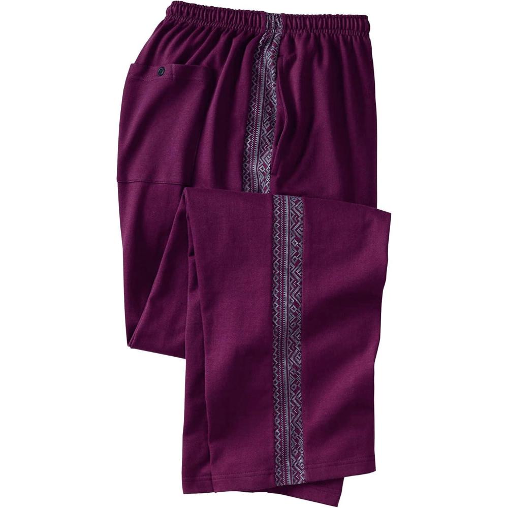 Elastic waist cozy-warm sweatpants with inner drawstring, one button-through back and two side seam pockets, open hems. Printed side panels on outside of legs. Open hemming for a roomy fitDrawstring at waist for easy, adjustable comfortWarm cotton/polyester blendMachine wash; imported Big inseam length abt. 29″Tall inseam length abt. 34″